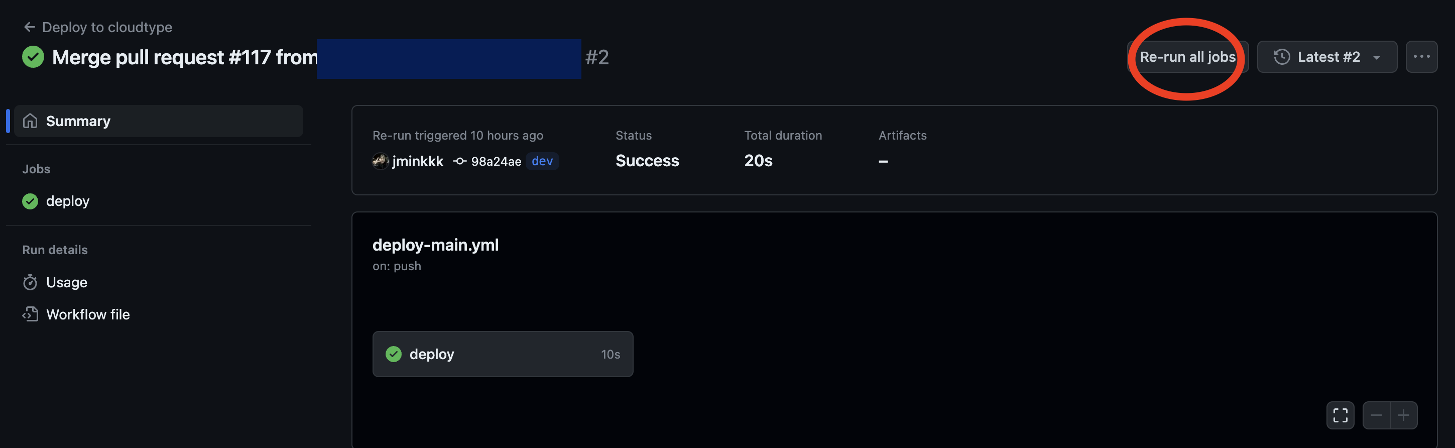 그 후 오류가 났던 워크 플로 실행 내역에서 Re-run all jobs를 실행하면 아래처럼 이번엔 성공한 것을 확인할 수 있다!!!